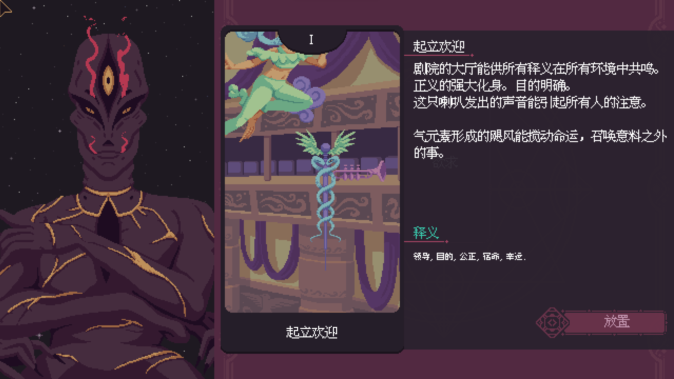3. 占卜。既然主角是预言女巫,那么本作自然离不开占卜。本作的占卜与塔罗牌占卜近似,都是通过对抽出卡牌的解读来完成。通过对占卜答案的选择,玩家可以收获不尽相同的能量,为新卡牌的创造做准备。除此之外,占卜出来的内容所引出的对话也往往很有意思,值得一看。