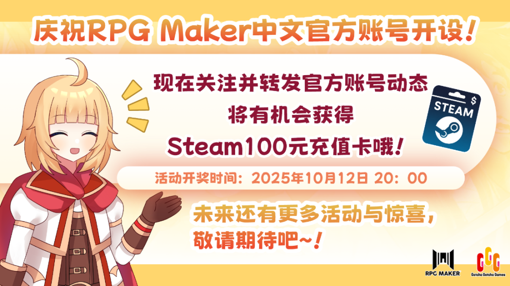 为庆祝官方账号的启用,RPG Maker官方将在B站与微博同步开启抽奖活动。即日起至2025年10月12日,关注官方账号并转发入驻动态,即可参与抽取100元Steam充值卡。未来还将会有更多惊喜活动!