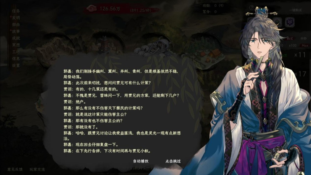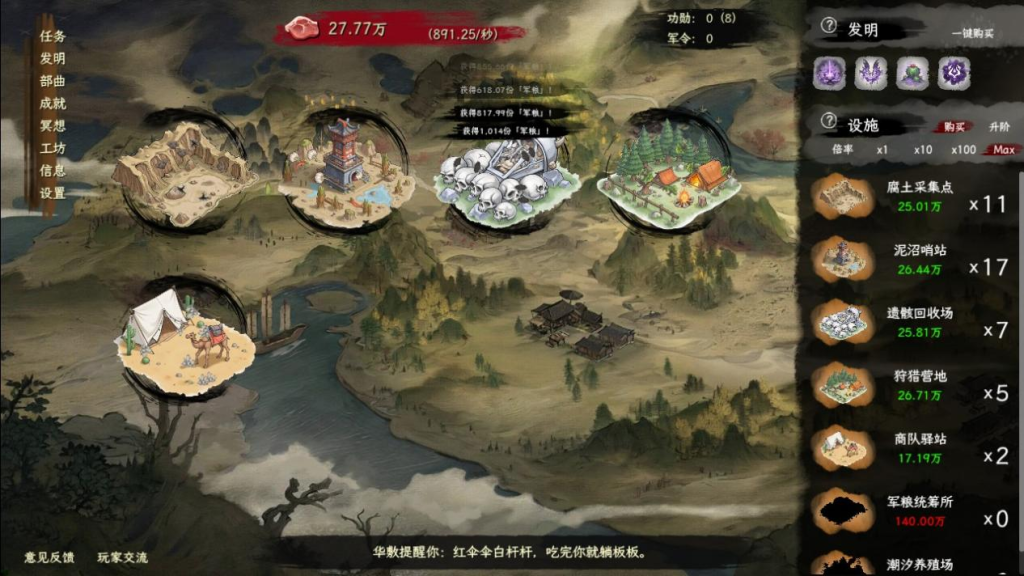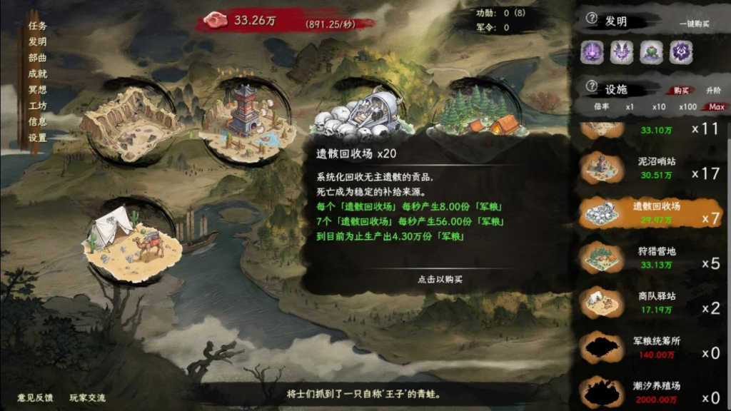 游戏玩法比较简单,我们开局先利用军粮建造一座建筑,然后能够通过鼠标点击亦或者挂机(自动点击)来获得军粮,获得的军粮能够用来建造新的建筑,以此产生循环。除此之外,游戏还有着任务系统,完成任务之后能够获得军粮、功勋、军令等。功勋在这一世积攒,但并不能够使用,只有到下一世才能够变现,功勋(积攒军粮也能够获取)能够用来点亮天赋,以此来增加军粮的获取速率。军令能够用来给建筑进阶,提升建筑的产量。
