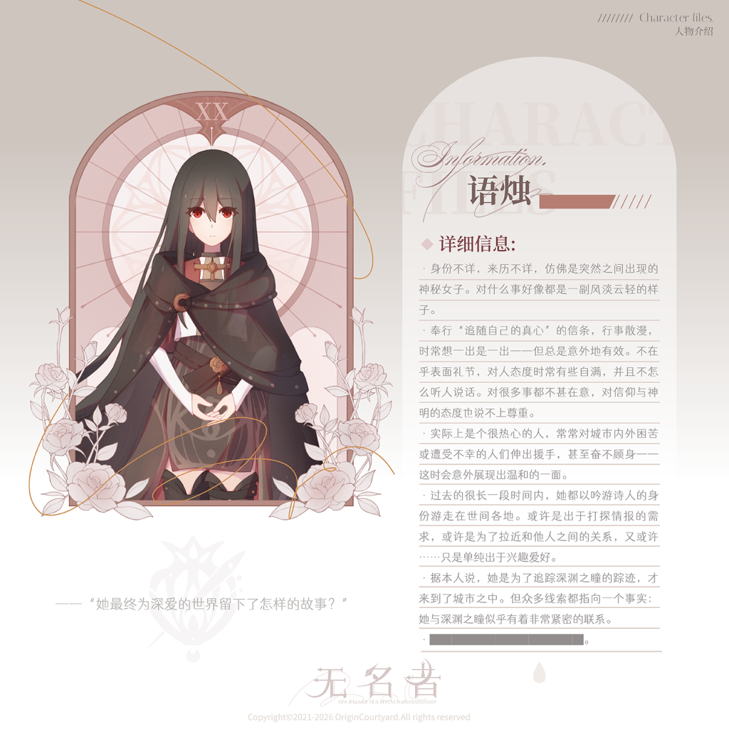 信息发布 原创文章 头条推荐 推荐 “十二夜歌。”——语烛【角色设定·六】 2026年4月14日2026年4月14日 admin “她跋涉过城市与荒原,自众生之间穿行而过。”“故事的结尾,她孤身向着深渊坠落。” XX|语烛CV:幺幺生日:某一年的1.29年龄:███身高:174cm———————————————————— 游戏交流群:736276823